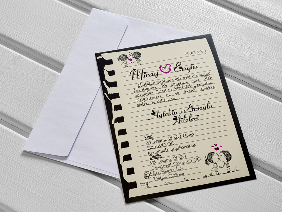İklim Davetiye 10405 fiyatı 1 Adet Düğün Davetiyesi içindir. Türkiye için geçerli perakende satış fiyatıdır. İklim Davetiye seçiminizi yaptıktan sonra bizimle iletişime geçiniz. Davetiye bilgilerinize göre tasarımı hazırlayıp, onayınızdan sonra ürünü baskıya giriyoruz.