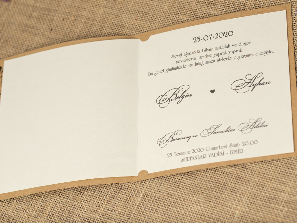 - Wedding Davetiye 8325 baskısı isteğiniz doğrultusunda hazırlanır, baskı kısmındaki yazıları ve yazı karakterlerini tamamen siz belirlersiniz.